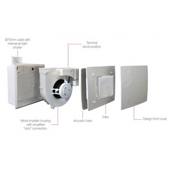 Kaitseaste IPX4. Kaasaegse sisekujunduse esteetiline lame esikate on hoolduseks kergesti eemaldatav. Universaalne väljalaskeava läbimõõduga 75 mm, mis võib paikneda üleval, all, paremal või vasakul. Täiendav külgmine sisselaskeava Ø50 mm (standardvarustus) sekundaarse väljatõmbe jaoks külgnevatest ruumidest. Sisefilter tiiviku ja mootori kaitsmiseks. Sellel on tagasilöögiklapp. Sisseehitatud heliisolatsioonivaht akustilise mugavuse tagamiseks. Täielikult taaskasutatavad plastkomponendid, keskkonnasõbralikud. Testitud vastavalt uusimatele standarditele: seadmed on TÜV Rheinlandi testitud, mis tähendab täpset ja ajakohast teavet elektriohutuse, jõudluse ja müratasemete kohta.