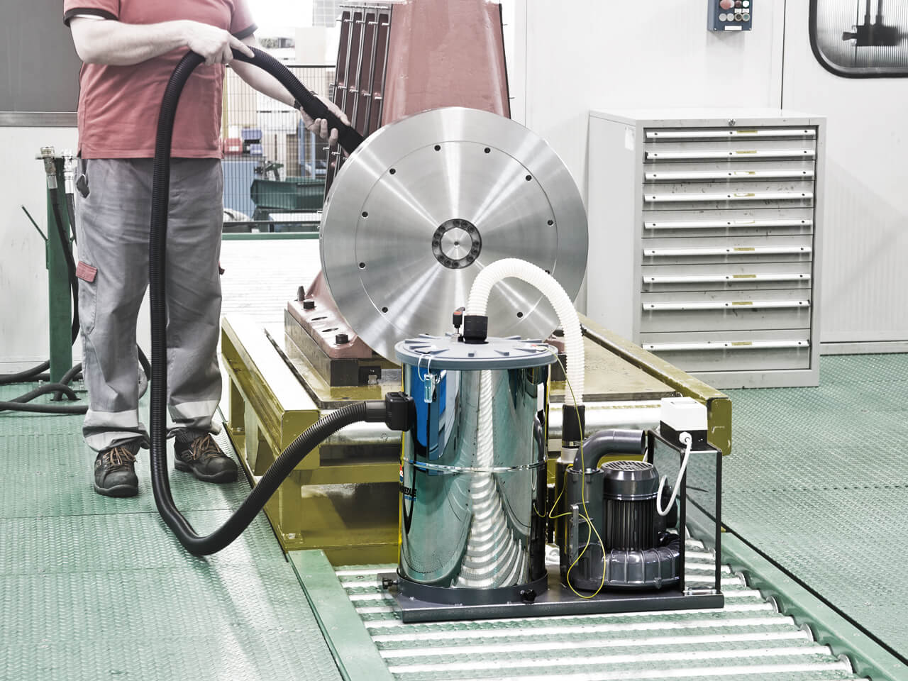 Vaakumturbiinide kasutamine tööstuslike tolmuimejate ehitamisel võimaldab tolmuimejat pidevalt kasutada. Need vaakumturbiinid on konstrueeritud vastavalt külgkanalite spetsiifilisele põhimõttele: tiivik liigutab vaakumõhku mööda kohustuslikku spiraalset marsruuti, põhjustades arvukaid õhukiirendeid ning põhjustades märkimisväärse rõhu ja vaakumi. Tööratas on paigaldatud otse mootori telje kohale ja kõik pöörlevad osad on dünaamiliselt stabiliseeritud, välistades igasuguse vibratsiooni. Turbiinid on kas üheastmelised (üks tiivik) või kaheastmelised (kaks tiivikut).