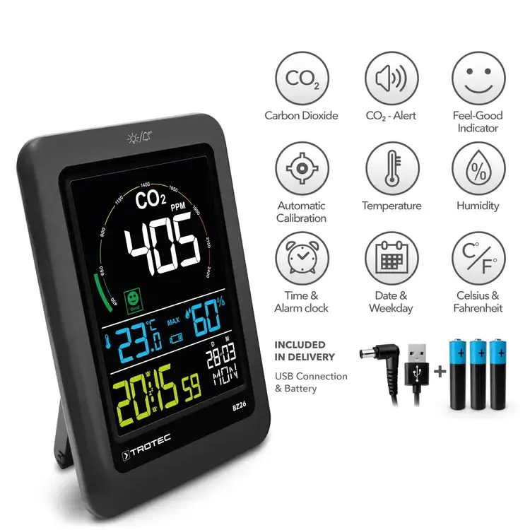 BZ26 abil saate siseõhu kvaliteedil usaldusväärselt silma peal hoida. Mõõteseadet saab kasutada vooluvõrgust (USB kaabel kaasas) või patareidega (3 x AAA tüüpi leelis, 1,5 V). Praktiline alus ja integreeritud seinakinnitus võimaldavad mõõteseadme positsioneerimisel vaba valikut. Aku töös tuleb CO 2 väärtuse määramiseks vajutada nuppu “ALLA”. Seadme USB-ühenduse kaudu töötamisel mõõdab BZ26 õhu CO 2 sisaldust täielikult automaatselt iga 6 sekundi järel.