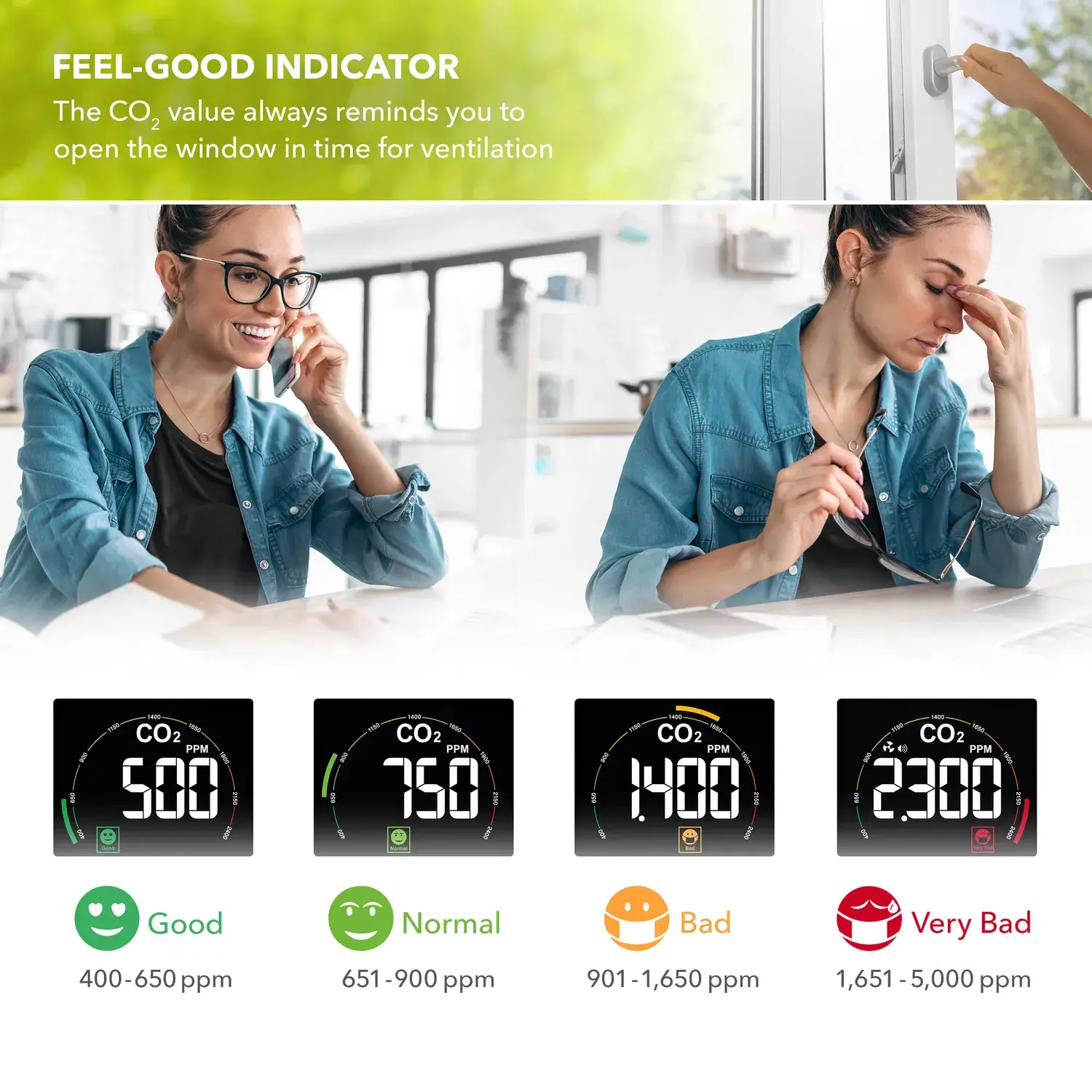 Õhukvaliteedil on meie heaolule tugev mõju. Õhu CO 2 sisaldus näitab hästi, millal on vaja ruumi akende avamisega ventileerida. Õigeaegne ventilatsioon on eriti oluline ruumides, kus on palju inimesi ja seda soovitatakse muu hulgas kaitsemeetmena õhu kaudu leviva koroonaviirustega nakatumise vastu. Temperatuur ja niiskus mõjutavad samuti meie tervist ja heaolu. Seetõttu tasub nendel siseõhu kvaliteedikriteeriumidel kogu aeg silma peal hoida.