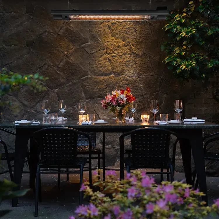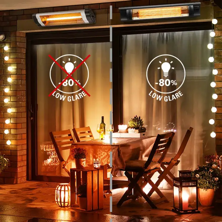 Täissoojusvõimsus väiksema heledusega: Kuna tajutav valgus on oluliselt vähenenud, tekib kiirgussoojendi vahetus läheduses mulje õdusast küünlavalgusest ja õhkkond on märgatavalt meeldivam. Terrassil või toitlustusäris juba olemasolev valgustuskontseptsioon on üldiselt vähem mõjutatud.