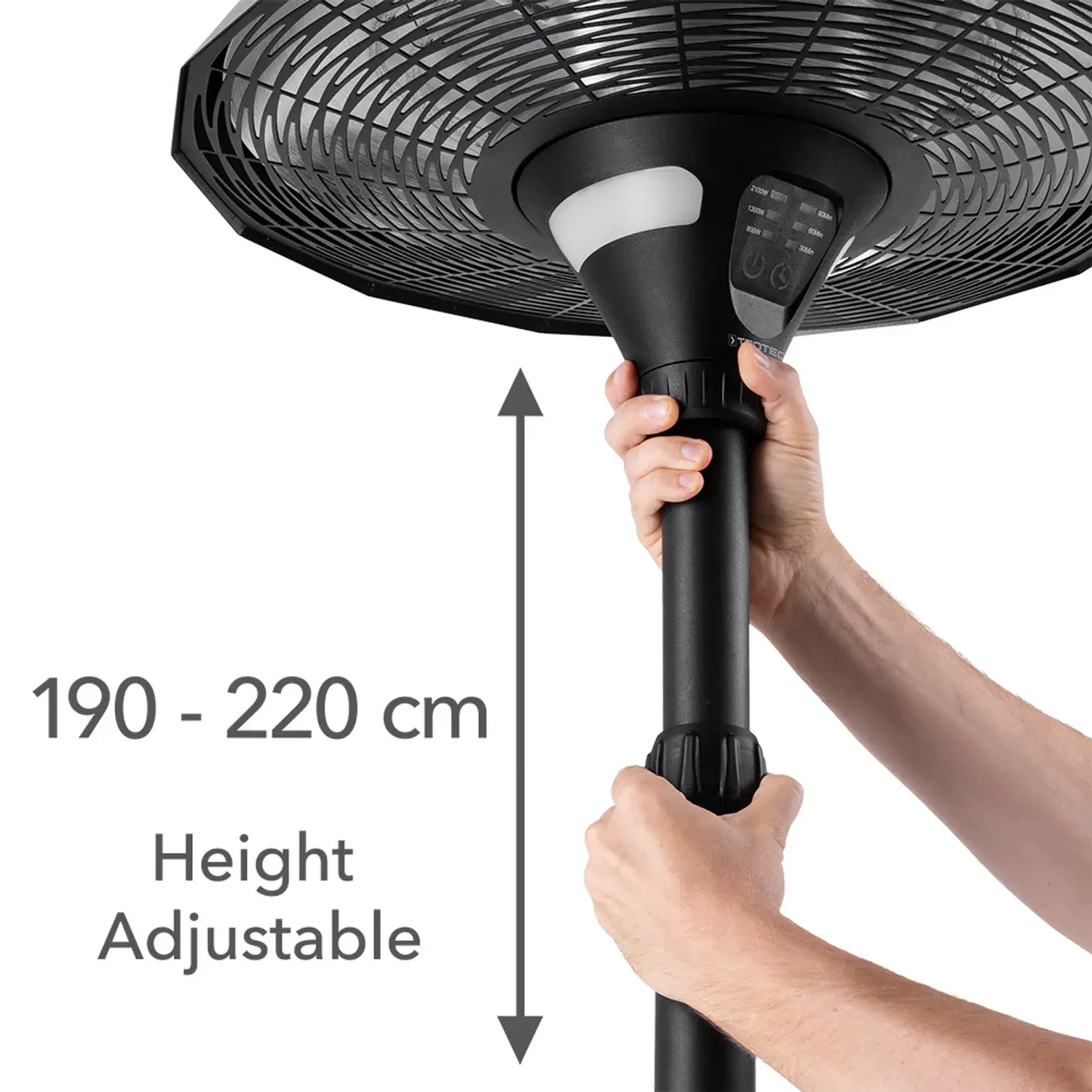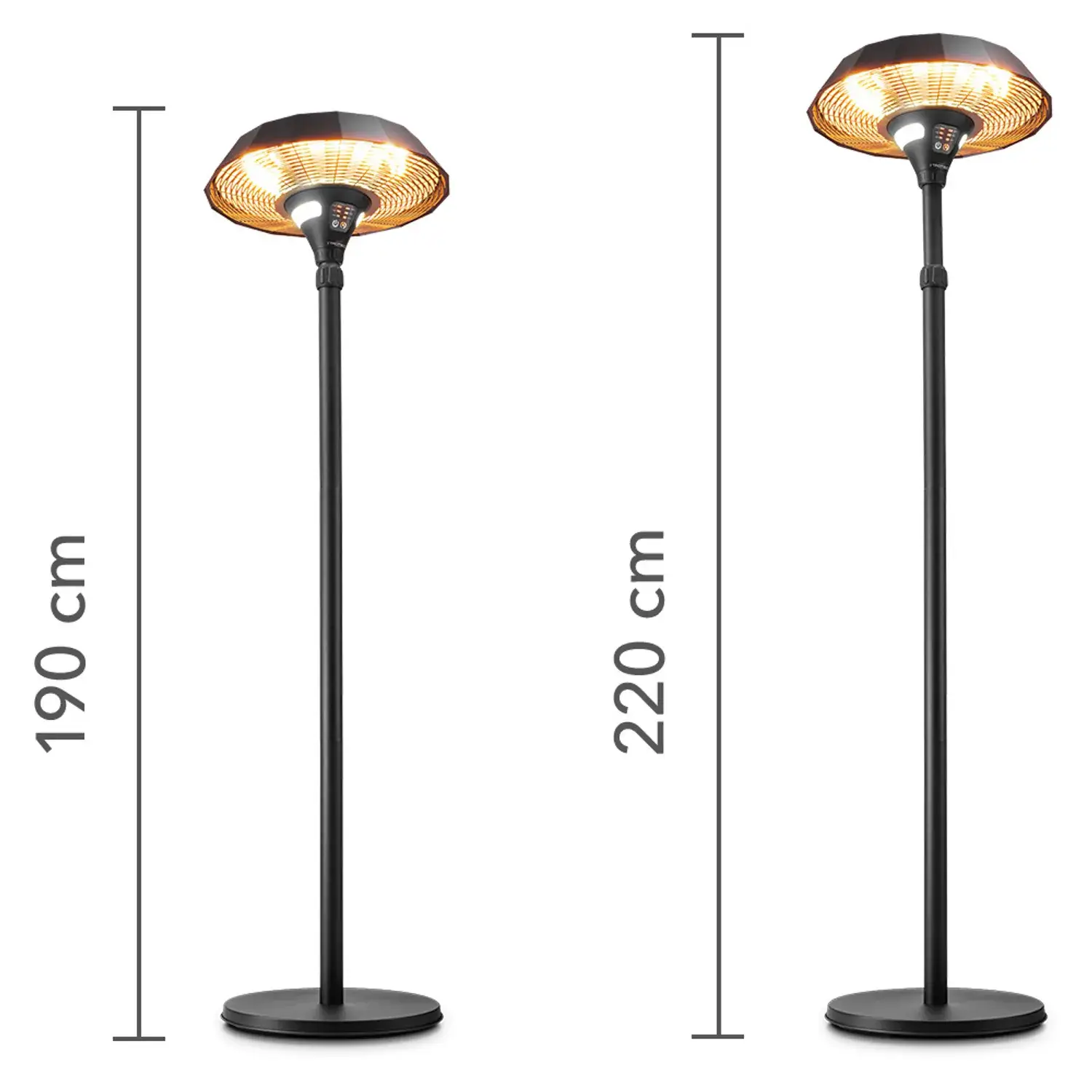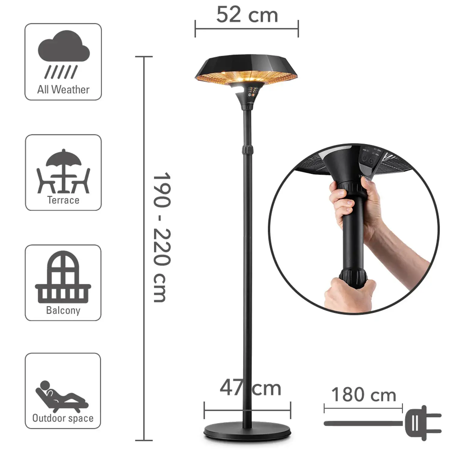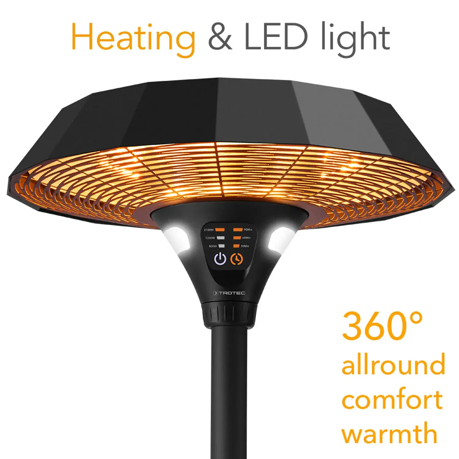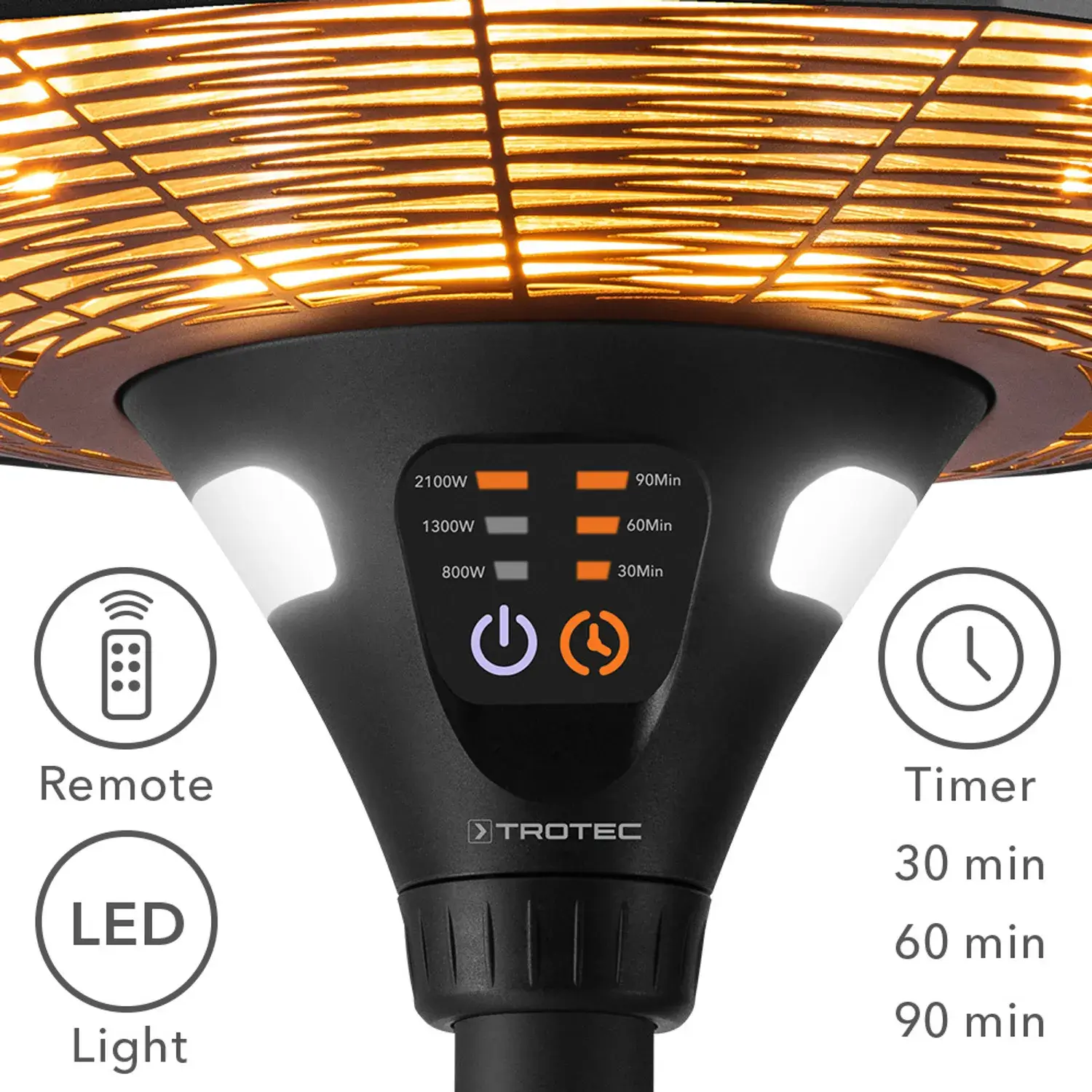 2100-vatine disain jalaga infrapuna soojuskiirgur IRS 2110 ühendab oma geomeetrilise kujuga silmapaistva tootedisaini ja keeruka funktsionaalsuse. Polügoonilise disainiga mattmust kiirgusküttekeha katab välitoitlustuse, terrassid ning istumis- ja seisualad kolmeastmelise igakülgse soojusega (800 W, 1300 W, 2100 W) – ja seda ilma pika eelsoojenduseta. Lülitage seade kaugjuhtimispuldi või puutetundliku juhtpaneeli abil sisse ja tunnetage koheselt meeldivat infrapunasoojust oma nahal. Vajadusel saab programmeerida väljalülitustaimeri 30-, 60- või 90-minutilise astemga, et kütteseade teatud aja möödudes täielikult ja automaatselt välja lülitada. Seisusoojenduse kõrgust saab reguleerida vahemikus 190-220 cm – oluliselt suurendab kasutusmugavust. Vajadusel saab sisse lülitada kahe valgusvihuga LED lauavalgustuse, atmosfäärilise atmosfääri loomiseks. See säästab lisatulesid ja energiakulusid.