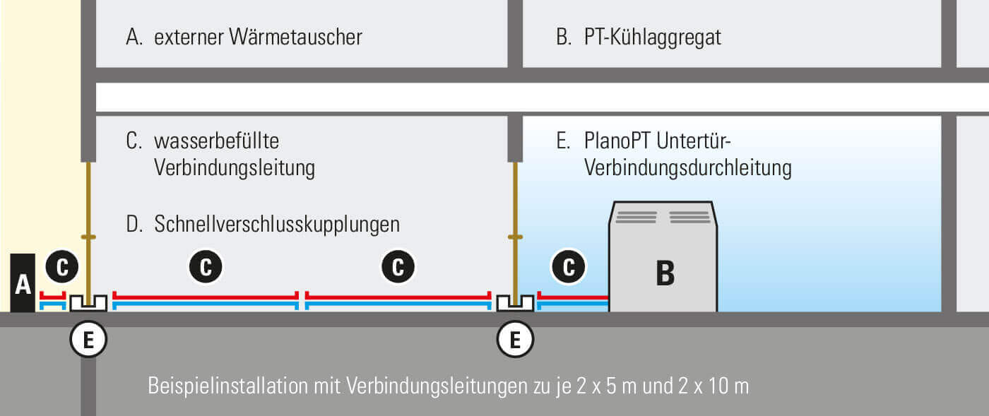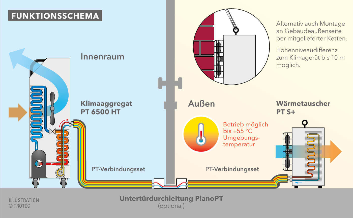 Pärast kohapeal seadistamist on PT 6500 HT kasutusvalmis vaid mõne minutiga. Toiteallikaks on vaja ainult 230 V pistikupesa ja ühendus välise soojusvahetiga toimub kiirelt tänu kiirühendustega ühenduskomplektile. Ühendusliinis ringleb ainult glükooliga lisatud vesi, nii et PT 6500 HT ühendamisel ja lahtiühendamisel ei saa kunagi tekkida külmutusagensi kadu. Ja mitut ühenduskomplekti kombineerides saab ühenduskaugust vajadusel suurendada kuni 30 meetrini, et saaks jahutada ka kaugemaid ja akendeta ruume.