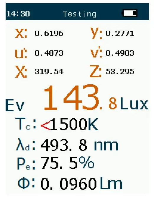 Valgusvoog: Φ, RGB parameeter, värvikaart, maksimaalne salvestus ja indikaator