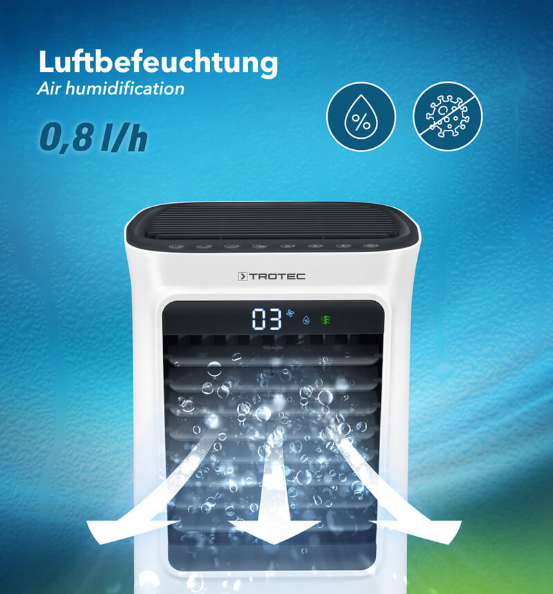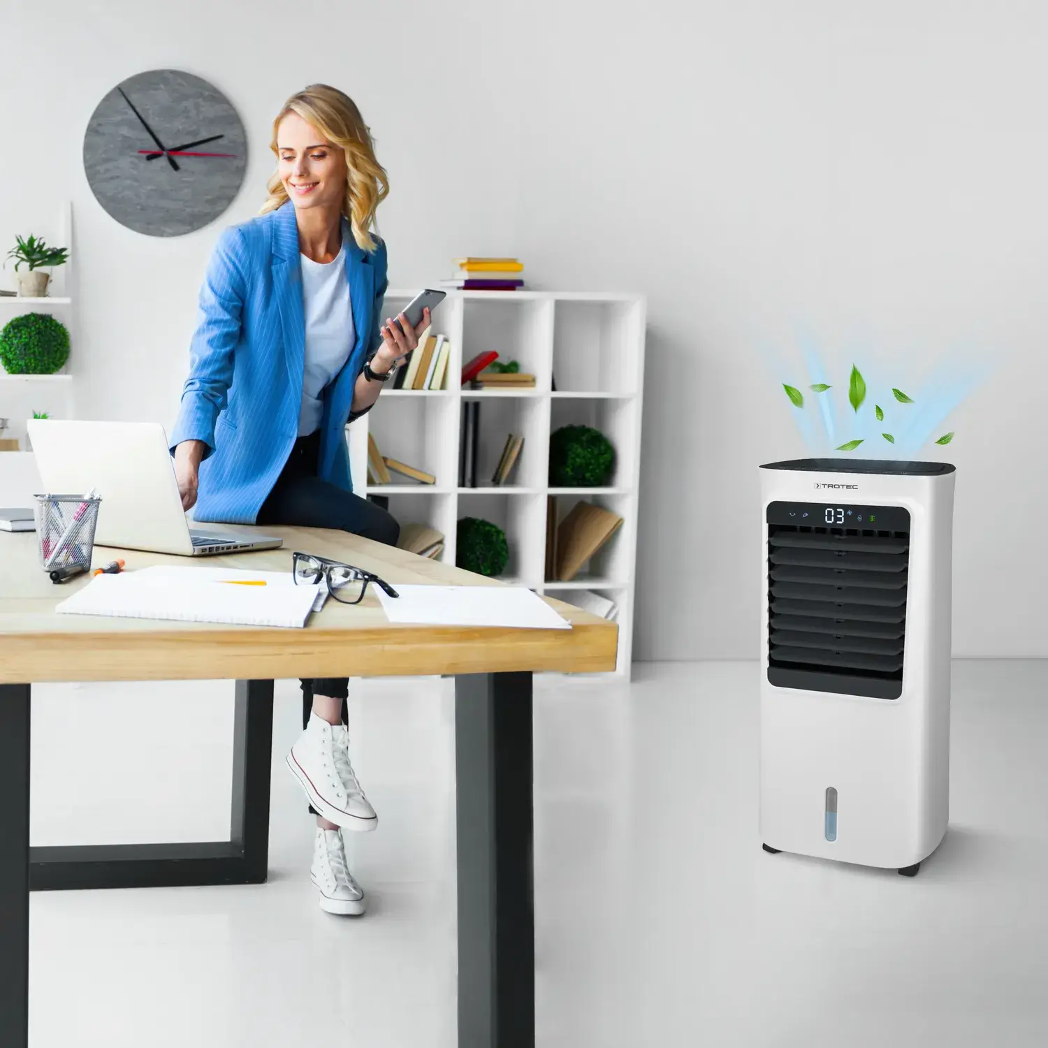 Mobiilne õhujahuti töötab loomuliku aurustusjahutuse põhimõttel. Teate seda omast kogemusest: kui puhute niiskele nahale, tunnete kohest jahutavat efekti, kuna aurustumisprotsess tõmbab soojuse ära. Õhkjahutite või õhujahutitega on sama lugu: Õhkjahuti sees on veega leotatud filtrimatt. Soe õhk suunatakse seadme tagant läbi märja filtrimati ja aurustudes jahtub. Nüüd jahedam õhk puhutakse seejärel ventilaatori abil tuppa.