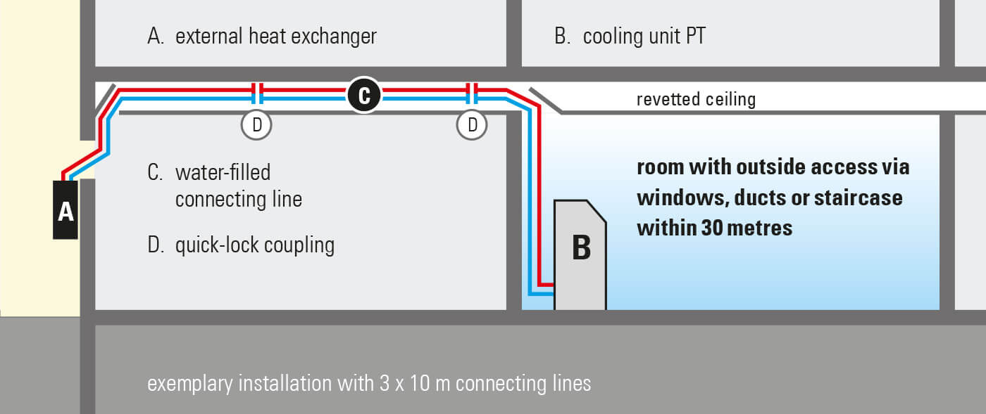 Vesijahutusega PT kliimaseadmete kasutamisel võib mõnikord olla keeruline paigaldada ühenduskomplekte väljapoole paigutatud soojusvaheti külge, olenevalt paigalduskohast, näiteks kõrgete seinte või puuduvate vahelagede korral, näiteks saalides.