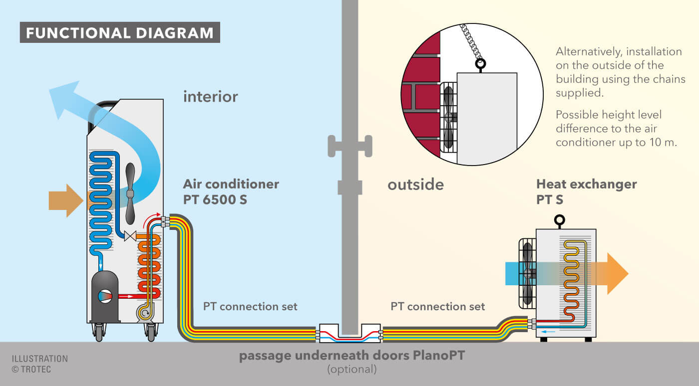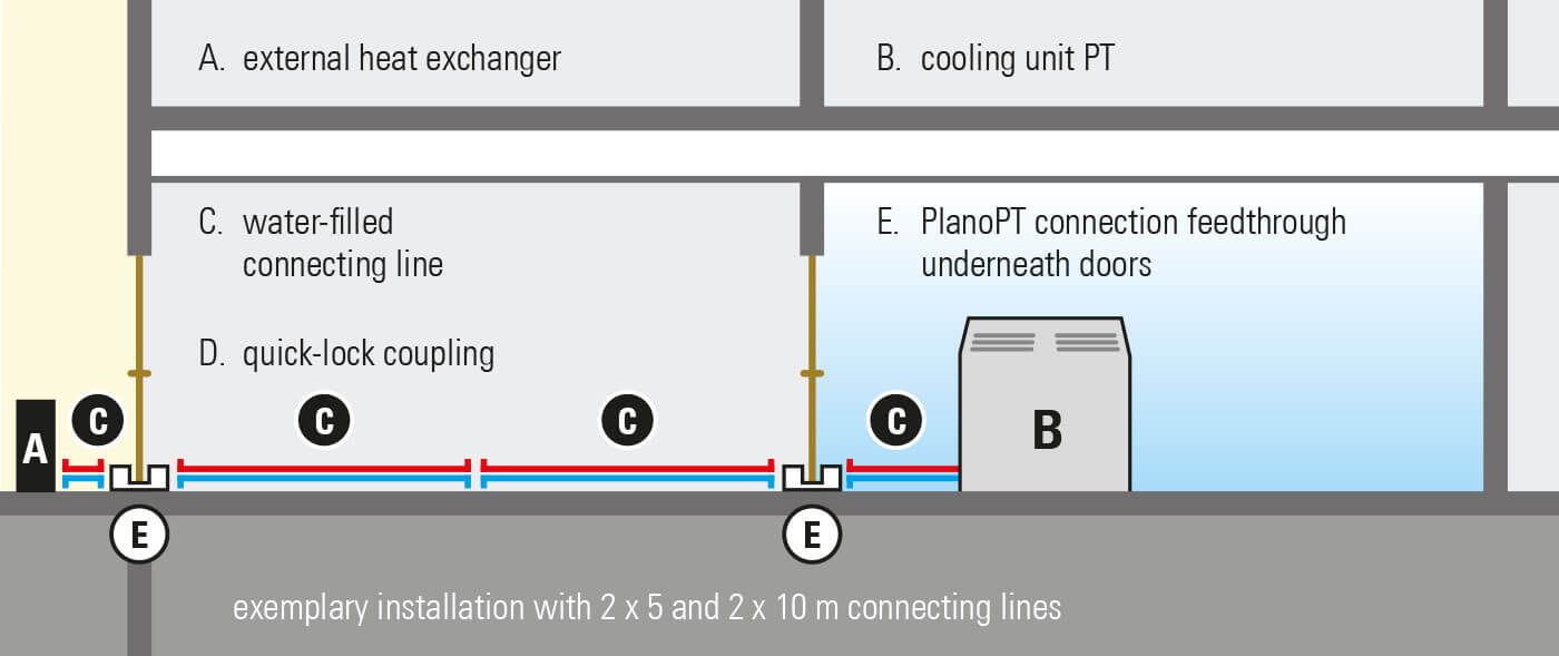 PlanoPT uksealuse liiniga saab vesijahutusega PT kliimaseadmete ja nende väliste soojusvahetite vahelisi ühenduskomplekte paigaldada ka aja säästmiseks uste alla – ühenduse kogupikkusega kuni 40 m.