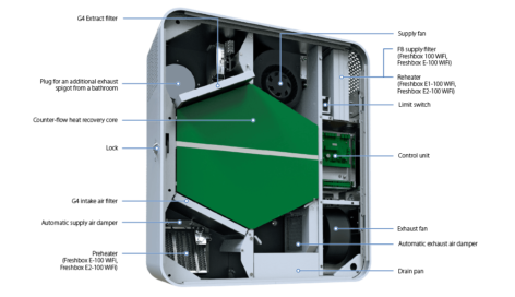 Freshbox E1-100 WiFi, Freshbox E2-100 WiFi: sisseehitatud G4 sissepuhkefilter ja G4 väljatõmbefilter tagavad õhu filtreerimise.