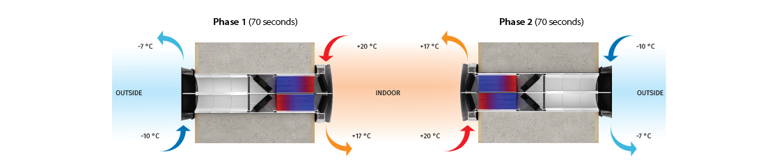 Üks ventilaatoritest töötab sissepuhkerežiimis: värske külm sissepuhkeõhk väljast voolab läbi esimese regeneraatori ning neelab endasse akumuleerunud soojuse ja niiskuse.