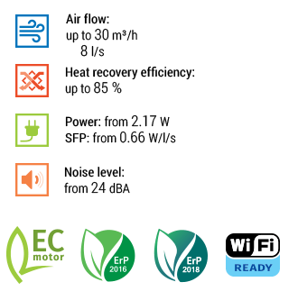Tasakaalustatud energiasäästu, sissepuhke ja väljatõmbe, ühe ruumi ventilatsiooni paigutus köögis, vannitoas ja abiruumides. Soojuse taaskasutuse tõttu ventilatsioonist tingitud soojuskadude vähendamine. Niiskuse tasakaal ja kontrollitav õhuvahetus loovad individuaalselt reguleeritava mikrokliima. WiFi-andmevahetus mitme ühe ruumi ventilatsiooniseadme vahel koordineeritud tööks. Juhitav Androidi või iOS-i nutitelefoni või tahvelarvutiga.