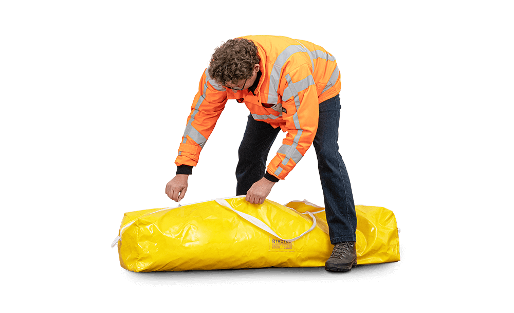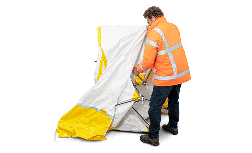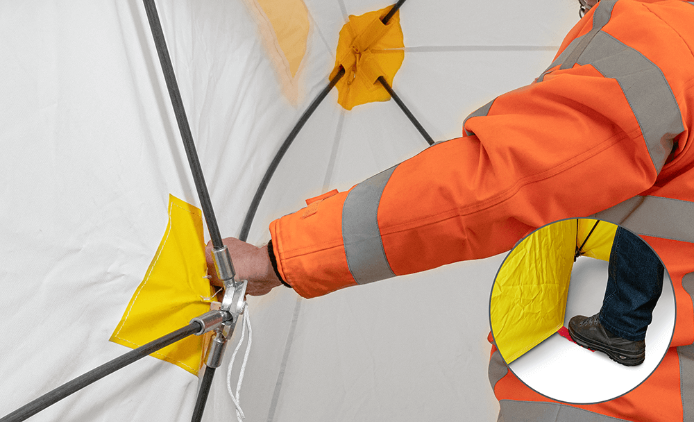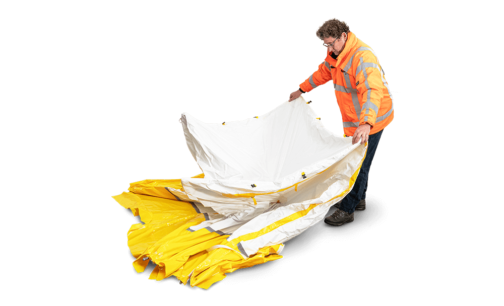 Tellimus peab olema: Telk on kompaktselt kokku volditud tarnekomplekti kuuluvas kandekotis. Vastupidav PVC-koti  saab kiiresti ja lihtsalt  ära panna igasse kaubikusse või hädaabisõidukisse. Tänu suurtele kanderihmadele saab kotti kanda ka näiteks üks inimene täies tööriietuses üle õla.
