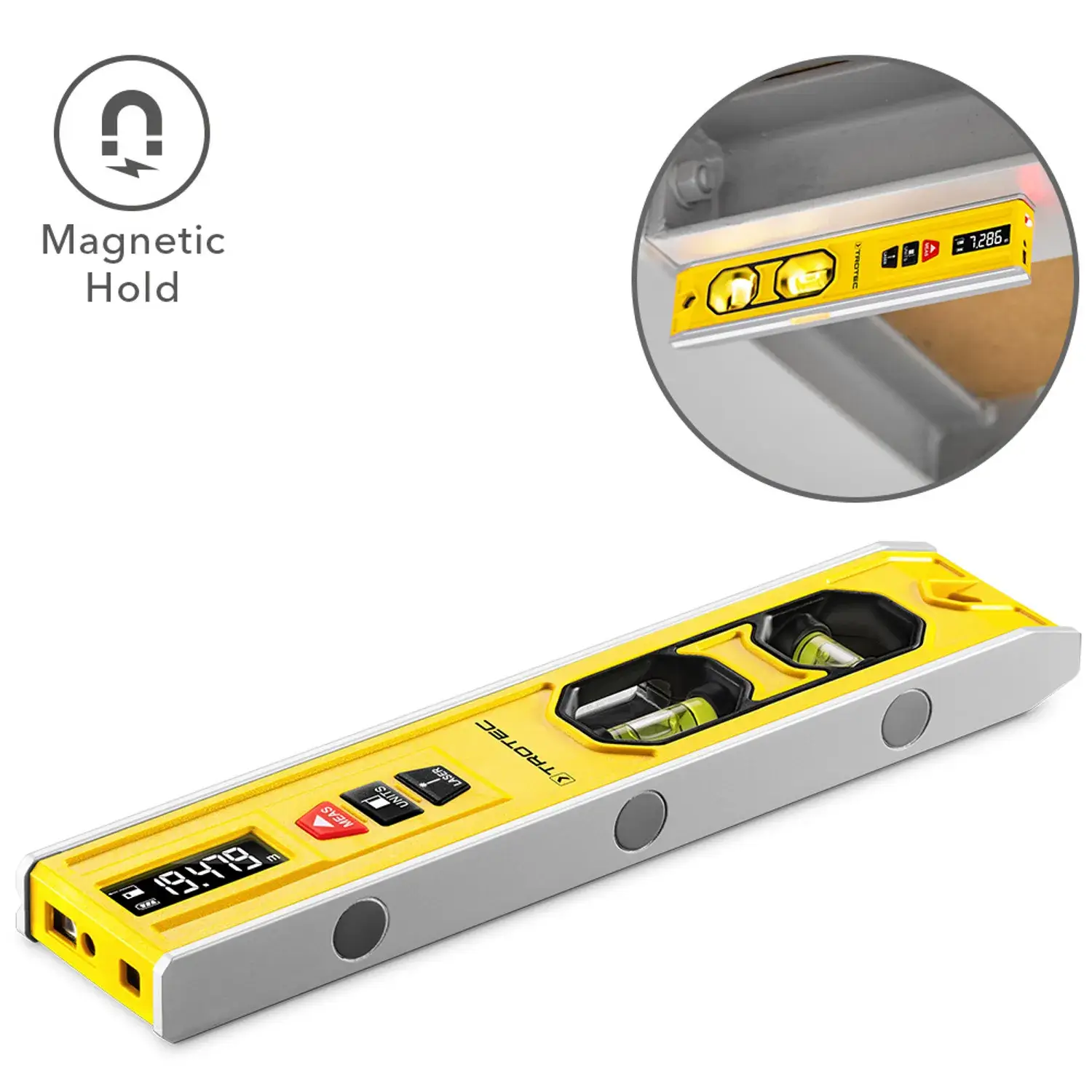 Tänu mõõteseadme ühele küljele sisseehitatud magnetitele saab laservesiloodi kinnitada staatiliseks fikseerimiseks ferromagnetiliste pindade külge. BD1L on ideaalne kaaslane ehitusplatsidel ja isetegemise sektoris. Miks osta täpsete mõõtmiste jaoks mitu seadet, kui leiad vesiloodi, punkt-/joonlaseri ja laserkauguse mooduli vaid ühest. Vesiloodi – palju funktsioone täiuslikuks joondamiseks.